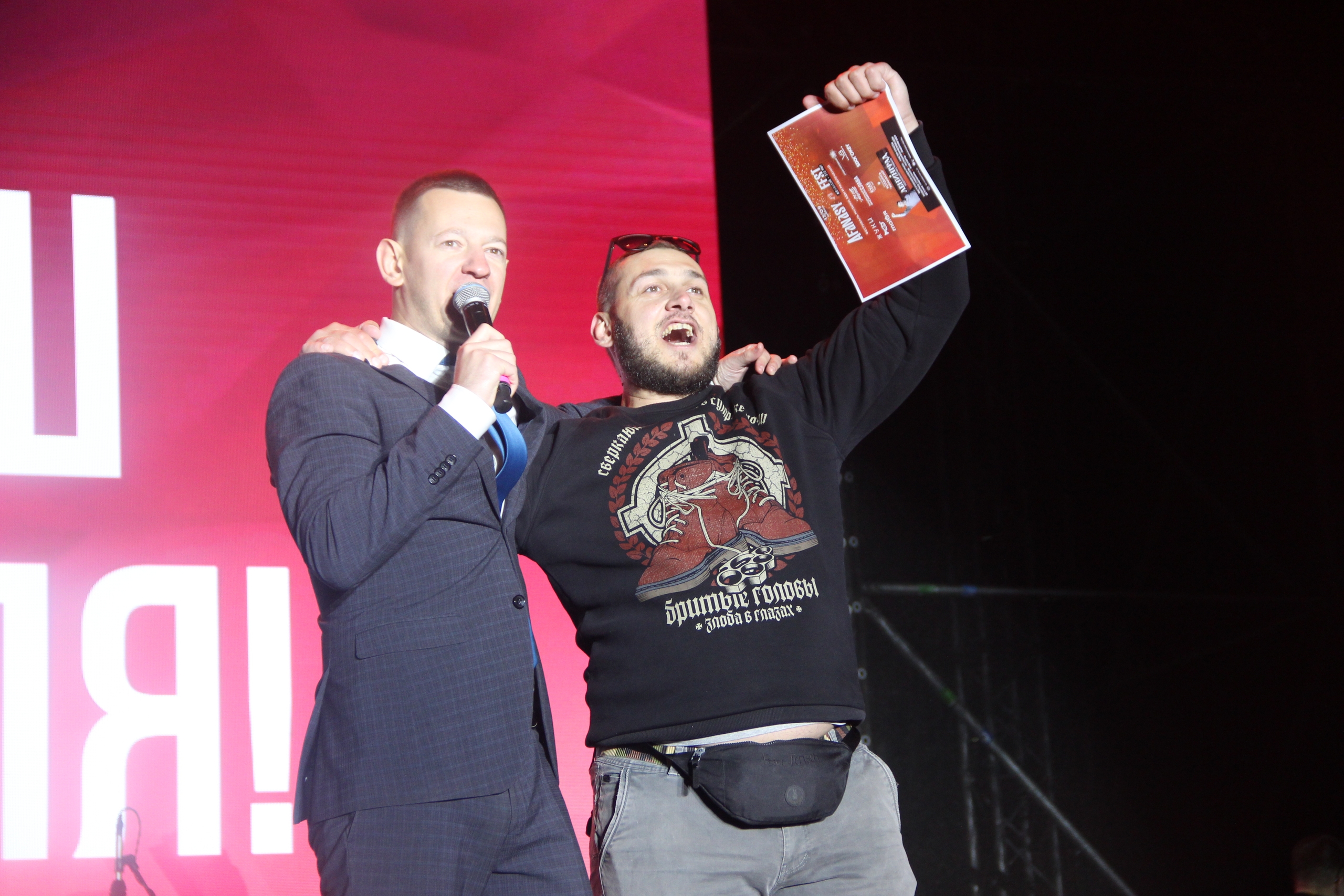 Вечером около 19:00 открылись ворота на территорию к главной сцене - народ хлынул слушать группу "Жуки" и разбирать самые удобные места, чтобы комфортнее было смотреть и слушать Шнура. Тут же среди самых удачливых разыгрывали ценные призы - от VR-шлема и PS5 до огромного телевизора и современных телефонов. Главный приз - автомобиль ВАЗ "Нива" достался молодому мужчине, который со сцены признался, что права на авто у него есть, а вот машины не было. "Теперь есть!" - констатировал ведущий вечера под ликующие крики толпы. И после небольшой паузы позвал на сцену главного организатора праздника - Максима Ларина. Тот задержался, но быстро объяснил, почему: